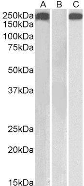 - HEK293 lysate (10ug protein in RIPA buffer) overexpressing Human THBS1 with C-terminal MYC tag probed with AF2629a (1ug/ml) in Lane A and probed with anti-MYC Tag (1/1000) in lane C. Mock-transfected HEK293 probed with AF2629a (1ug/ml) in Lane B. Primary incubations were for 1 hour. Detected by chemiluminescence.
