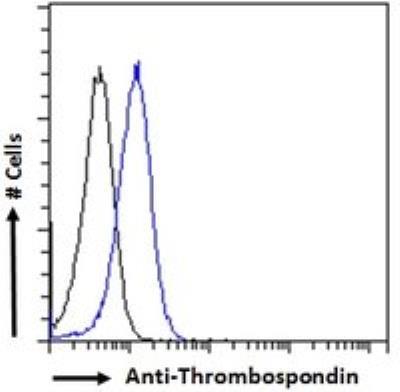 - Flow Cytometry: Thrombospondin-1 Antibody [NBP2-42522] - analysis of paraformaldehyde fixed A431 cells (blue line), permeabilized with 0.5% Triton. Primary incubation 1hr (10ug/ml) followed by Alexa Fluor 488 secondary antibody (2ug/ml). IgG control: Unimmunized goat IgG (black line) followed by Alexa Fluor 488 secondary antibody.