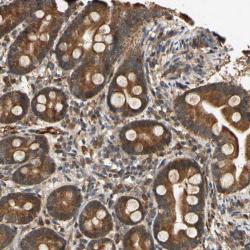 - Immunohistochemical staining of human duodenum shows distinct cytoplasmic positivity in glandular cells.